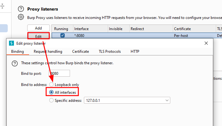 Now that we have the CA installed, we can start our proxy. First, make sure that Burp proxy is set on All interfaces.