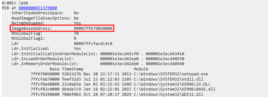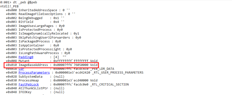 We can also see that the base address is at an offset of 0x10 from the PEB