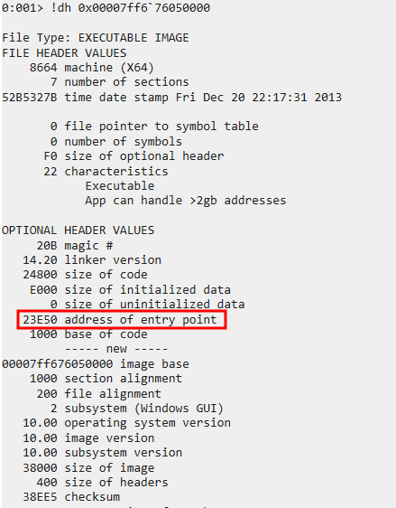 If we display more PE header information at that base address, we can see that the address of the entry point has a relative address of 23E50 from this base.