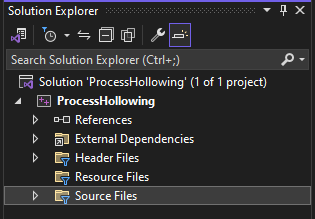 We'll be using Microsoft Visual Studio for our project. Create a new empty C++ console app. Here I'll call the project "ProcessHollowing". This should produce the following solution structure.