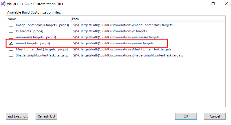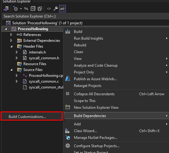 From here, we need to set up build customizations for assembly files. Right-click on the project and go to Build Dependencies -> Build Customizations...