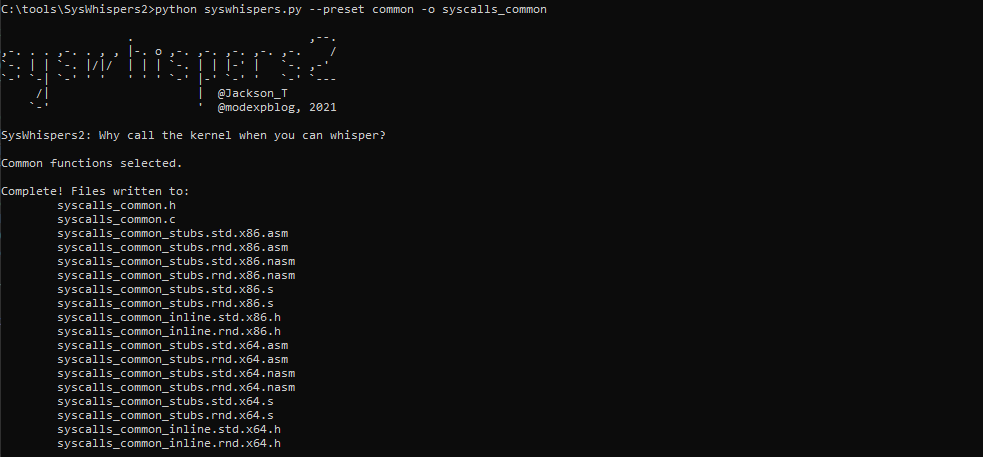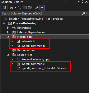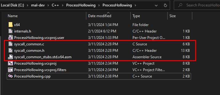 Take note of the syscalls_common.c, syscalls_common.h, and syscalls_common_stubs.std.x64.asm files. Copy/move them to the project folder.