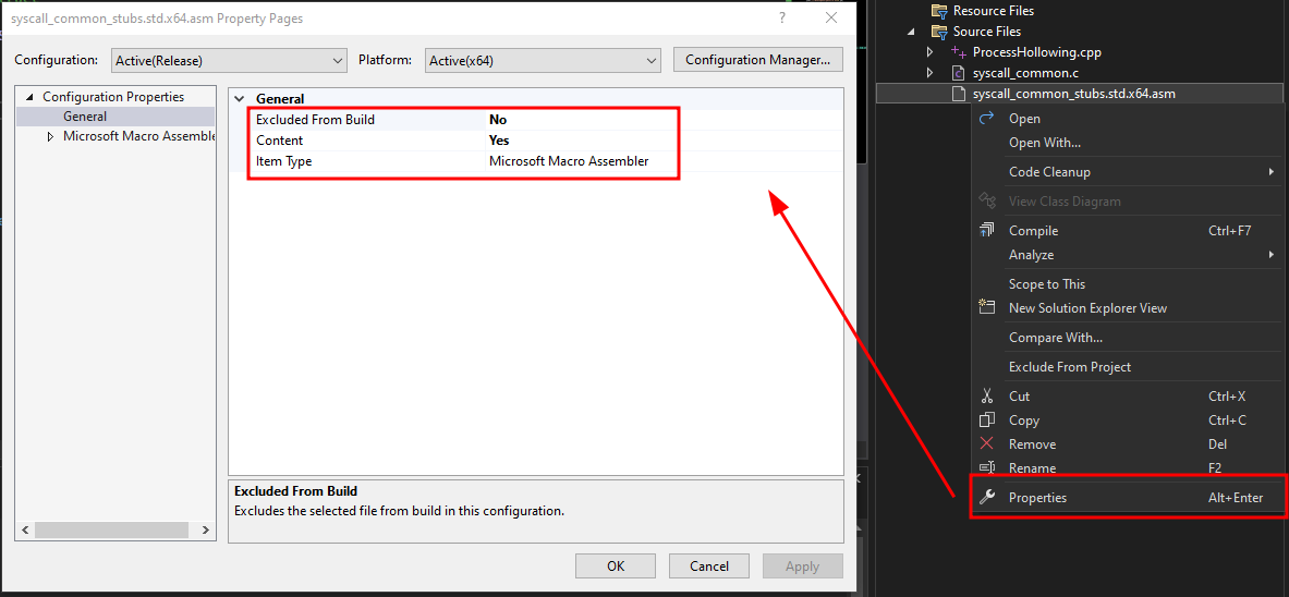 Our last step is to properly include the .asm file to our project. Right-click on the file and go to Properties. Make the following changes to our active configuration of x64: