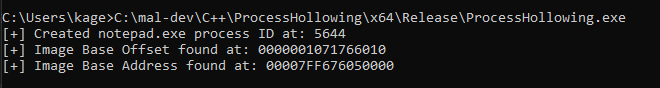 printf("[+] Image Base Address found at: %p\r\n", lpImageBaseAddress);