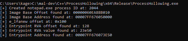 printf("[+] Created notepad.exe process ID at: %d\r\n", pid);